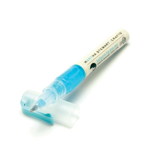 Ball Point Glue Pen. This ultra-fine, ballpoint glue pen is one of our favorites. The glue goes on blue for easy visibility and dries clear. Use it wet, and you'll get a strong, permanent bond. Allow it to dry, and you'll have a sticky, temporary bond for positioning items.