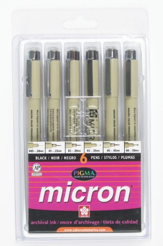 When accuracy, minute details and preservation count, the unparalleled archival quality of pigma micron pens makes them everyone's first choice. Artist, writers and illustrators reach for pigma micron and know their work is safeguarded with the permanence of pigma ink. Experience smooth, skipfree writing and crisp ink colors that leave consistent lettering and lines every time. It has achieved universal appeal and is carried by technical professionals, artists and crafters alike anthropologists, entomologists, scientists, research laboratories, archivists, architects, professional diamond cutters, cartoonists, manga and anime artists, illustrators, heirloom quilters and decorative fabric artists. Features archival quality ink for use in acidfree environments, chemically stable, waterproof, fade resistant, no smears, feathers or bleedthrough on most papers. Applicable for graphic art, scrapbook, archival recording, pen and ink illustrations, freehand art, rubber stamps, car tooning and fabric design. Technical qualities are archival quality pigma ink, six point sizes, no smear or feather when dry, waterproof and chemical proof, fade resistant, does not bleed through most papers, meets astm and acmi nontoxicity standard and not evaluated for cosmetic use on skin. Set contains 6 different pieces having nib sizes for precise line width are 0.20mm, 0.25mm, 0.30mm, 0.35mm, 0.45mm and 0.50mm respectively. Available in 6piece per pack and black color.